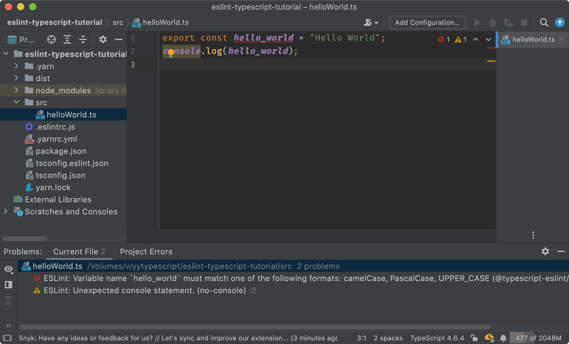 このhello-world.tsは、わざとコーディング規約に違反するコードになっています。1行目の変数hello_worldはキャメルケースになっていません。2行目では、使ってはいけないconsole.logが使われています。